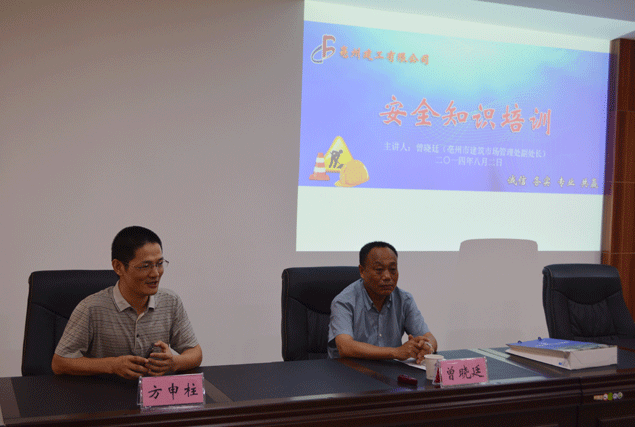 2014年8月2號,在亳州建工有限公司三樓會議室舉辦了建筑施工安全生產(chǎn)知識講座。本此講座由公司總經(jīng)理方申柱主持,并有幸邀請了亳州市建筑市場管理處副處長曾曉廷前來授課。亳州建工全體員工、項目負責(zé)人等40余人參加了這次培訓(xùn)。
