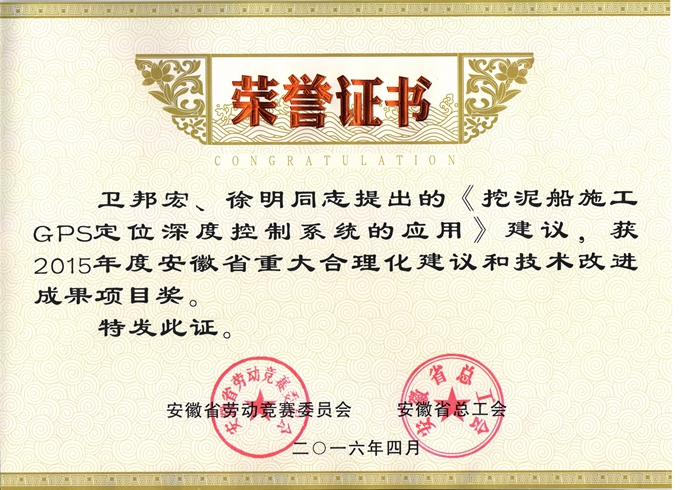 近日,從安徽省勞動(dòng)競(jìng)賽委員會(huì)、安徽省總工會(huì)傳來喜訊,安徽交航疏浚工程分公司提出的《挖泥船施工GPS定位深度控制系統(tǒng)的應(yīng)用》建議,榮獲2015年度安徽省重大合理化建議和技術(shù)改進(jìn)成果項(xiàng)目獎(jiǎng)。