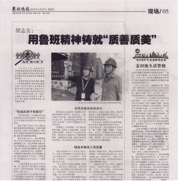 眼前的胡志友有些消瘦,操著一口標(biāo)準(zhǔn)的普通話,談吐風(fēng)雅、眼神認(rèn)真。2013年,他從山東濟(jì)南來到亳州,就職于亳州建工有限公司。作為一名建造師,他始終將安全生產(chǎn)和工程質(zhì)量放在第一位。他說,對建筑行業(yè)來說,就是要以一顆“工匠心”做人做事,發(fā)揚(yáng)魯班精神,做到精益求精。