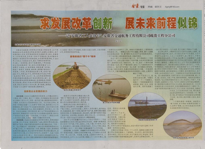 5月20日,安徽工人日報(bào)第2版“風(fēng)采”專版大幅刊登了題為《求發(fā)展改革創(chuàng)新,展未來前程似錦》——榮獲 “安徽省工人先鋒號”的安徽交航疏浚工程分公司先進(jìn)事跡。