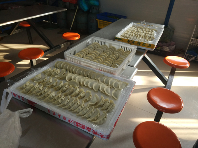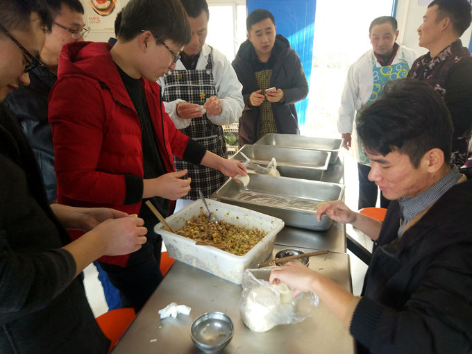大家分工合作、合理搭配,和面、搟皮、拌餡、包餃子,一派其樂融融的景象。轉瞬之間,一個個飽滿誘人的餃子從他們手里如同魔法般冒了出來。在歡樂、溫馨的氣氛中,上百多個餃子新鮮出爐。
