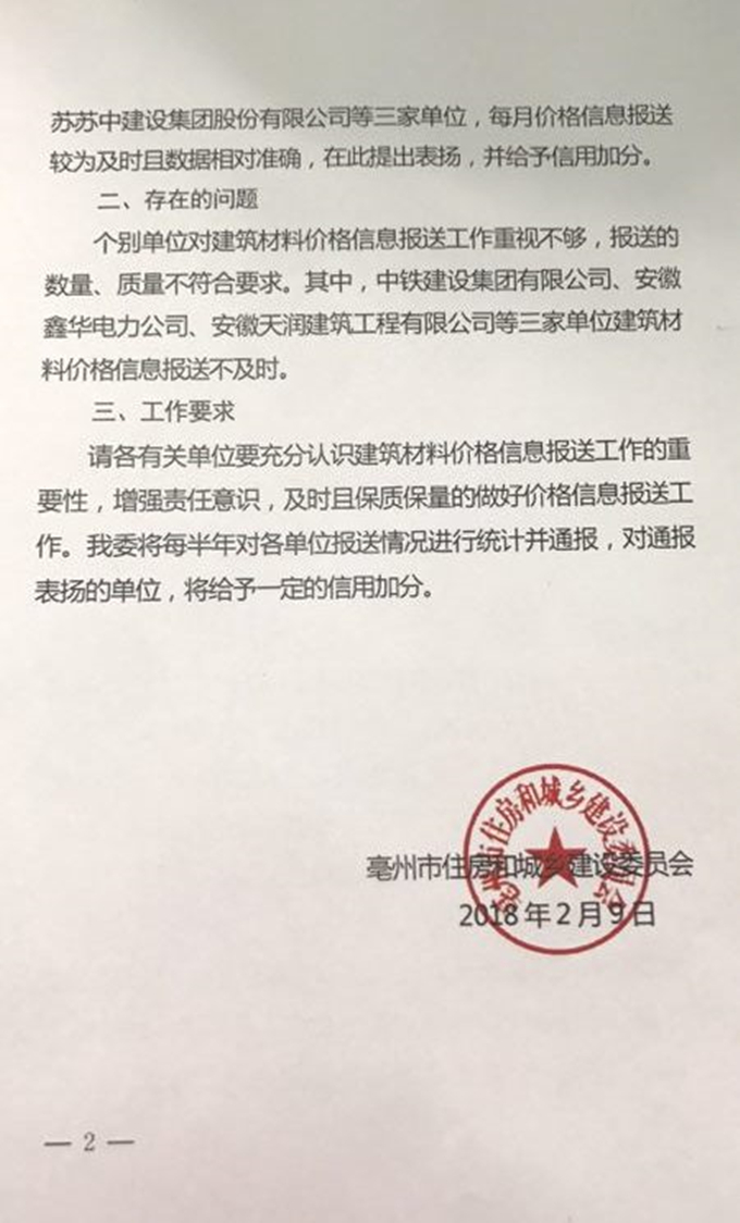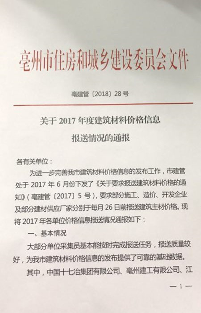 2018年2月9日,亳州市住房和城鄉(xiāng)建設(shè)委員會下發(fā)了《關(guān)于2017年度建筑材料價格信息報送情況的通報》(亳建管〔2018〕28號),文件中對亳州建工在2017年度建筑材料價格信息報送工作中積極主動配合、每月按時報送建筑材料價格且數(shù)據(jù)準(zhǔn)確的做法表示肯定,并提出表揚,給予信用加分的獎勵。