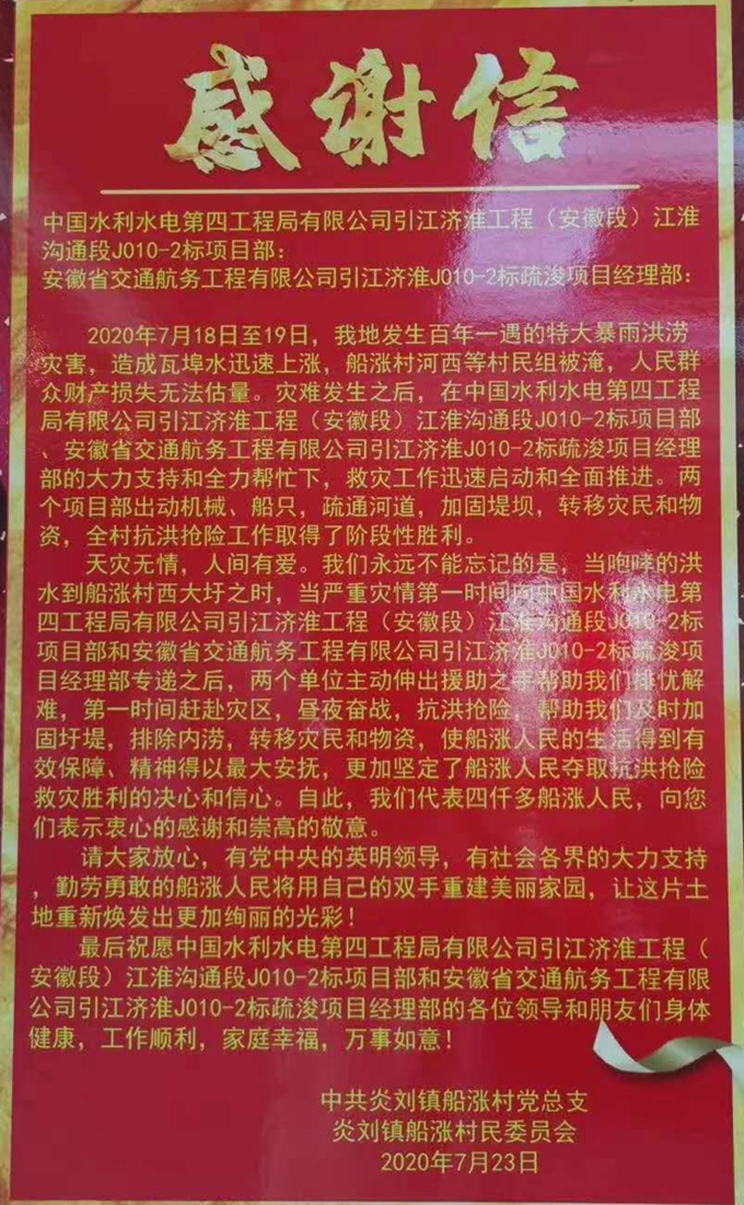 7月23日,中共炎劉鎮(zhèn)船漲村黨總支和炎劉鎮(zhèn)船漲村村民委員會發(fā)來一封感謝信,信中高度贊揚了安徽交航引江濟淮項目部在參與當(dāng)?shù)乜购榫葹?zāi)工作中的擔(dān)當(dāng)與作為,并且當(dāng)?shù)卮逦€在信中代表四千多位船漲村民表達了由衷感謝。