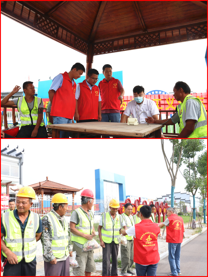 為進(jìn)一步提高工人健康意識(shí)和自我保健能力,倡導(dǎo)健康生活方式,9月29日下午,安徽交航亳州2號(hào)3號(hào)地塊PPP項(xiàng)目黨支部聯(lián)合當(dāng)?shù)厣鐓^(qū),邀請(qǐng)社區(qū)醫(yī)院醫(yī)護(hù)人員為項(xiàng)目一線工友們進(jìn)行愛(ài)心義診活動(dòng)。