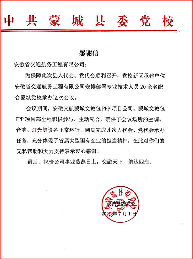 會(huì)議期間,蒙城文教包PPP項(xiàng)目公司、蒙城文教包PPP項(xiàng)目部安排20余名專業(yè)技術(shù)人員全程積極參與、主動(dòng)配合,周密部署、精心安排,以“嚴(yán)之又嚴(yán)、細(xì)之又細(xì)、實(shí)之又實(shí)、全之又全”的態(tài)度,派駐專業(yè)技術(shù)人員24小時(shí)對(duì)會(huì)場(chǎng)的空調(diào)、音響、燈光等設(shè)備進(jìn)行維護(hù)調(diào)試,保障了會(huì)議期間會(huì)場(chǎng)設(shè)備安全運(yùn)行,圓滿完成了此次人代會(huì)和黨代會(huì)承辦任務(wù)。為此,蒙城縣委黨校發(fā)來感謝信,對(duì)蒙城項(xiàng)目公司的全力配合和無私幫助表示感謝,并祝安徽交航事業(yè)蒸蒸日上。