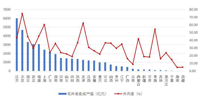 從外向度(即本地區(qū)在外省完成的產(chǎn)值占本地區(qū)建筑業(yè)總產(chǎn)值的比例)來看,排在前三位的地區(qū)是北京、天津和上海,分別為74.76%、62.56%、60.44%。此外,外向度超過30%的還有青海、福建、湖北、江蘇、內(nèi)蒙古、陜西、河北、山西、湖南、遼寧、江西、福建、廣東等13個地區(qū)(圖4)。