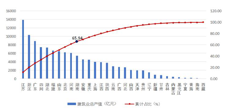 除江蘇、浙江外,總產(chǎn)值超過5000億元的還有廣東、四川、湖北、福建、山東、北京、河南、湖南8個地區(qū),上述10省市完成的建筑業(yè)總產(chǎn)值占全國建筑業(yè)總產(chǎn)值的65.94%(圖1)。