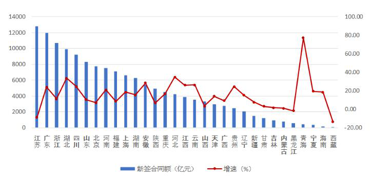簽合同額均超過10000億元,分別為12763.52億元、11925.7億元、10702.53億元。此外,新簽合同額超過6000億元的還有湖北、四川、山東、北京、河南、福建、上海、湖南等8個地區(qū)(圖3)。新簽合同額同比增長最快的是青海,達到77.15%。此外,河北、湖北、安徽、云南、江西、四川、貴州、廣東、河南等9個地區(qū)的增幅均超過20%。西藏、江蘇、黑龍江3個地區(qū)新簽合同額出現(xiàn)負增長,其中西藏的負增長超過了10%。