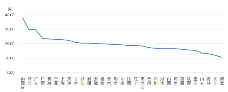 從各地區(qū)建筑業(yè)總產(chǎn)值增長情況看,所有地區(qū)的建筑業(yè)總產(chǎn)值較上年同期都有不同幅度的增長。其中,內(nèi)蒙古的增幅最大,達到了37.93%。此外,湖北、廣東、廣西、青海、寧夏、上海、天津、甘肅、浙江、新疆、安徽等11個地區(qū)的增幅均超過20%(圖2)。