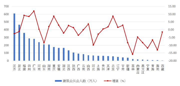 2021年上半年,全國建筑業(yè)從業(yè)人數(shù)超過百萬的地區(qū)共13個。江蘇、浙江依然是從業(yè)人數(shù)大省,人數(shù)分別為608.55萬人和464.95萬人。此外,福建、四川、廣東、河南、山東、湖南等6地區(qū)從業(yè)人數(shù)均超過200萬人。