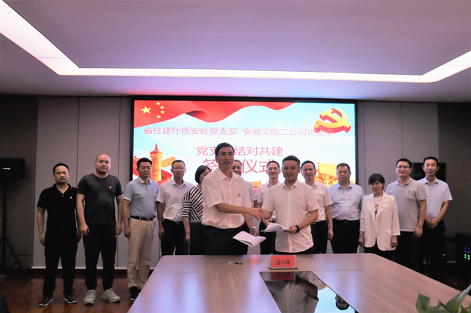 8月19日下午,安徽省住建廳工程質(zhì)量安全監(jiān)管處黨支部來安徽交航引江濟淮新時代文明實踐點開展“支部建在工地上”主題黨日活動,并與二公司黨支部簽訂結(jié)對共建協(xié)議。省住建廳工程質(zhì)量安全監(jiān)管處處長何以文、副處長陳鐘,三級調(diào)研員丁金穎、四級調(diào)研員董理論;公司黨委書記、董事長方申柱,黨委副書記、工會主席黃國平,黨委委員、副總經(jīng)理張瓊等領(lǐng)導(dǎo)參加活動并見證簽約。