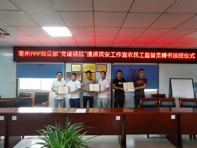 為推動(dòng)公司新時(shí)代文明實(shí)踐點(diǎn)“黨建領(lǐng)航”提質(zhì)筑安工作走深走實(shí),日前,亳州PPP項(xiàng)目新時(shí)代文明實(shí)踐點(diǎn)舉行農(nóng)民工監(jiān)督員聘任儀式。經(jīng)過前期推薦、審核、考察、公示等一些列環(huán)節(jié),最終有3名農(nóng)民工符合規(guī)定要求,正式被聘任為農(nóng)民工監(jiān)督員。