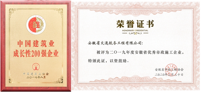 中國(guó)建筑業(yè)成長(zhǎng)性200強(qiáng)企業(yè)、安徽省優(yōu)秀市政施工企業(yè)