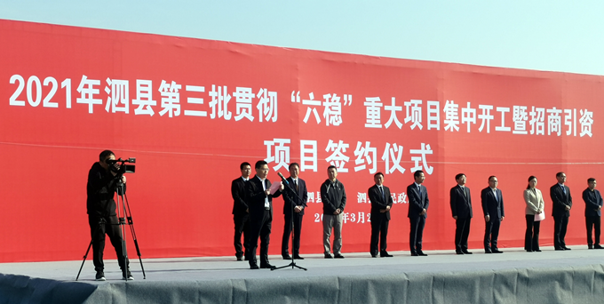 3月26日上午,由泗縣2021年第三批貫徹“六穩(wěn)”重大項目集中開工暨招商引資項目簽約儀式在安徽交航參建的泗縣長三角綠色農(nóng)產(chǎn)品加工物流產(chǎn)業(yè)園施工現(xiàn)場舉行。宿州市市委常委、泗縣縣委書記張志強,宿州市政協(xié)副主席、泗縣縣委副書記、縣長王法立,縣委副書記王汝娜及泗縣農(nóng)業(yè)農(nóng)村局等領(lǐng)導出席開工儀式。公司財務(wù)總監(jiān)高偉應(yīng)邀出席,并與泗縣主要領(lǐng)導共同為項目奠基。