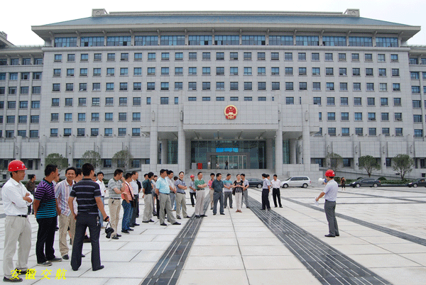 徐華磊首先對各位領導的到來表示感謝,接著就工程概況、項目施工重點、難點、亮點作了一一介紹,包括土方施工中淤泥土處理、花崗巖材料采購、面層鋪裝時的高程軸線平整度控制、水池制作安裝、噴泉水景的結(jié)構(gòu)安裝、景觀燈等等。此次觀摩由北廣場開始,經(jīng)內(nèi)庭院,到南廣場,最后參觀了正在施工的四館廣場。