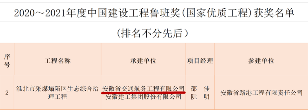 近日,中國(guó)建筑業(yè)協(xié)會(huì)公布了2020~2021年度中國(guó)建設(shè)工程魯班獎(jiǎng)(國(guó)家優(yōu)質(zhì)工程)名單,安徽交航承建的淮北市采煤塌陷區(qū)生態(tài)綜合治理工程榮登榜單,獲評(píng)中國(guó)建設(shè)工程最高獎(jiǎng)項(xiàng)——魯班獎(jiǎng)。