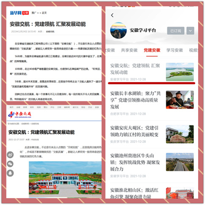 近日,新華社(新華網(wǎng))、學(xué)習(xí)強(qiáng)國(guó)、中安在線等中央及省級(jí)主流媒體,紛紛聚焦安徽交航黨建工作,集中報(bào)道了十九大以來(lái)安徽交航深入學(xué)習(xí)貫徹習(xí)近平新時(shí)代中國(guó)特色社會(huì)主義思想,堅(jiān)持和加強(qiáng)黨的領(lǐng)導(dǎo),推進(jìn)全面從嚴(yán)治黨及以黨建領(lǐng)航高質(zhì)量發(fā)展等方面取得的一系列成果。
