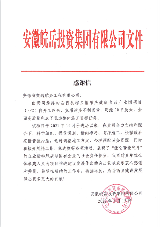 日前,公司收到業(yè)主方皖岳集團(tuán)感謝信,對(duì)公司岳西縣粽鄉(xiāng)情節(jié)慶健康食品產(chǎn)業(yè)園項(xiàng)目部全體參建人員為推進(jìn)項(xiàng)目建設(shè)作出的突出貢獻(xiàn)表示衷心感謝。