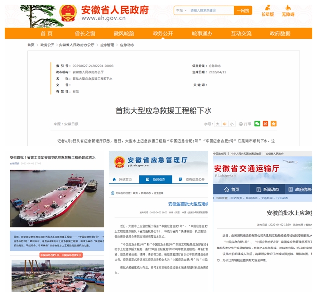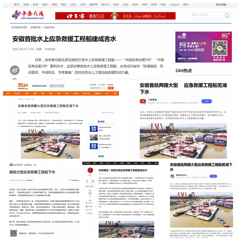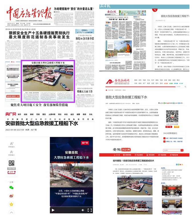 日前,由安徽交航負責實施的省內首批大型水上應急救援工程船——“中國應急合肥1號”“中國應急合肥2號”順利建成吉水,這一重要消息通過安徽省國資委、中安在線發(fā)布后,立即引發(fā)社會廣泛關注,獲中國應急報、央廣網(wǎng)、安徽日報、安徽商報、瀟湘晨報等主流媒體以及安徽國企網(wǎng)、安徽新聞網(wǎng)、九派新聞、騰訊網(wǎng)、新浪網(wǎng)以及搜狐網(wǎng)等多家國內知名新聞網(wǎng)站集中報道,其中安徽省人民政府、安徽省交通運輸廳、安徽省應急管理廳等政府網(wǎng)站紛紛進行了轉載。