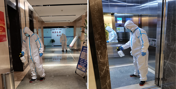 圖為防疫人員對(duì)公司辦公室、電梯間、樓梯間等公共場(chǎng)所進(jìn)行全面消毒。