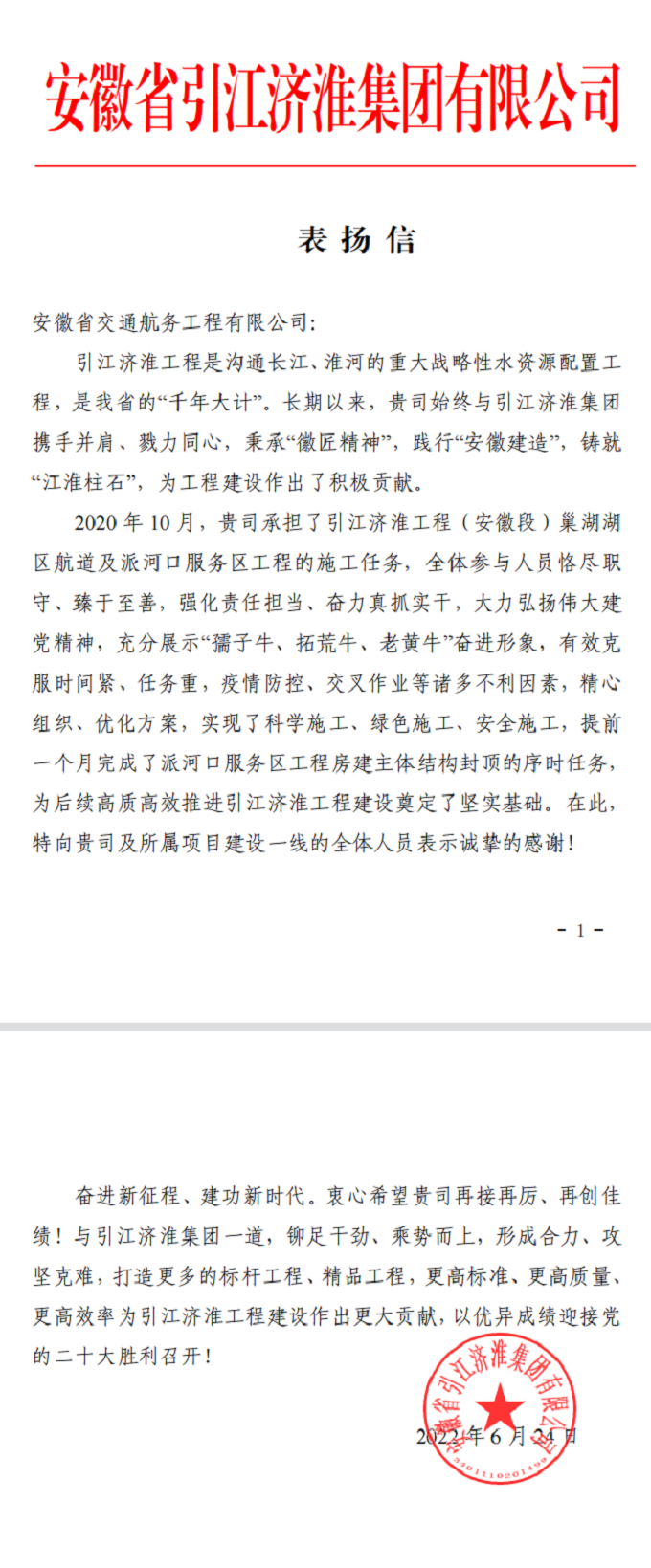近日,安徽交航收到安徽省引江濟(jì)淮集團(tuán)有限公司發(fā)來(lái)的表?yè)P(yáng)信,對(duì)安徽交航引江濟(jì)淮工程(安徽段)巢湖區(qū)航道及派河口服務(wù)區(qū)工程項(xiàng)目在項(xiàng)目管理、工程進(jìn)度、疫情防控、安全文明施工等方面的優(yōu)異表現(xiàn)予以表?yè)P(yáng)和感謝。