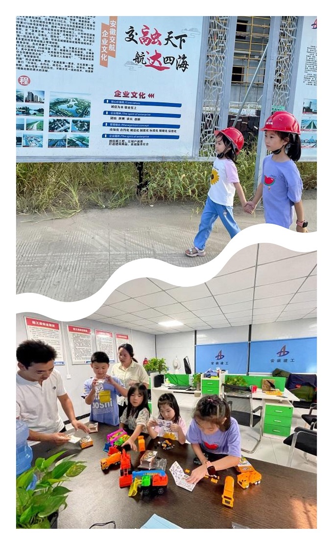 本次活動(dòng)以“交流話(huà)夢(mèng)想”形式拉開(kāi)序幕,小朋友們收到了項(xiàng)目部精心準(zhǔn)備的“小候鳥(niǎo)”學(xué)習(xí)用品禮包,在自我介紹中暢享未來(lái)許下“童心愿望”,在益智活動(dòng)中動(dòng)手拼裝工程車(chē)輛模型,享受親情溫暖、收獲友情歡樂(lè)?;顒?dòng)不僅讓孩子們玩得盡興,更將寓教于樂(lè)進(jìn)行到底。在父母的帶領(lǐng)下,孩子們迎來(lái)工地“初體驗(yàn)”,孩子們帶上安全帽,參觀項(xiàng)目參觀了辦公區(qū)、生活區(qū)以及施工現(xiàn)場(chǎng),學(xué)習(xí)項(xiàng)目建設(shè)的知識(shí)和安全常識(shí),陪爸爸媽媽吃一頓工作餐,“零距離”體驗(yàn)父母的日常工作、生活的環(huán)境,體會(huì)父母工作的艱辛和不易。