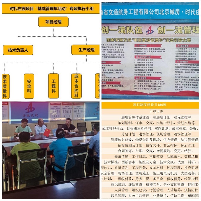 為深入貫徹落實集團二屆二次職代會暨2022年工作會議精神和安徽交航公司三屆四次職代會暨三屆二次工代會精神,根據(jù)集團公司“項目基礎(chǔ)管理年”活動方案和安徽交航基礎(chǔ)管理活動年啟動會要求,進一步推動項目基礎(chǔ)管理建設(shè),時代莊園項目部成立專項執(zhí)行小組,啟動“項目基礎(chǔ)管理年”第一階段掛圖作戰(zhàn)暨基礎(chǔ)管理工作自查自糾行動。