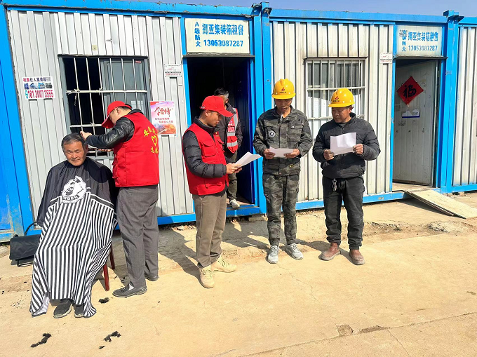 潭沖河家園項目發(fā)動青年志愿者們?yōu)轫椖抗と税l(fā)放文明宣傳手冊,講解宣傳合肥市民公約(守則),同時團支部組織志愿者服務(wù)活動,為工人提供義務(wù)理發(fā)。