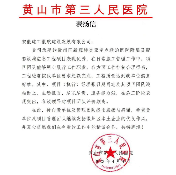 近日,安徽建工徽航建設(shè)發(fā)展有限公司所承建的徽州區(qū)新冠肺炎亞定點(diǎn)救治醫(yī)院附屬及配套設(shè)施應(yīng)急工程項(xiàng)目收到黃山市第三人民醫(yī)院發(fā)來的表揚(yáng)信,信中對(duì)項(xiàng)目施工管理、工程進(jìn)度和工程質(zhì)量予以充分肯定,并對(duì)公司及項(xiàng)目管理團(tuán)隊(duì)提出表揚(yáng)和感謝。