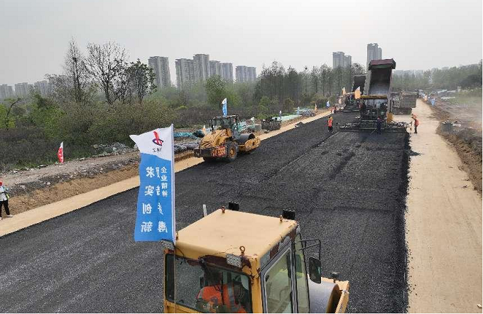 4月11日中午,青海路項(xiàng)目施工現(xiàn)場機(jī)械轟鳴、彩旗飄揚(yáng),項(xiàng)目道路水泥穩(wěn)定碎石試驗(yàn)段順利動(dòng)工,大型攤鋪機(jī)、壓路機(jī)、輸料車輛忙碌而有序地實(shí)施鋪設(shè)作業(yè),一條灰色的路面慢慢向前延伸。