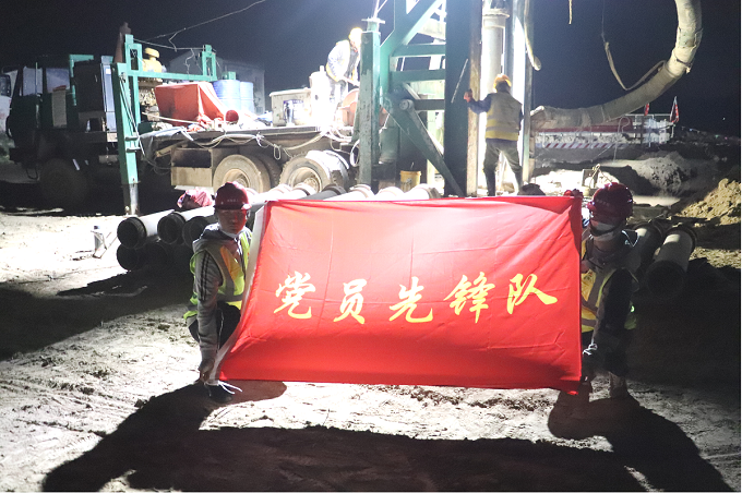 為加快推進工程進度,項目部吹響了2023年施工沖鋒號角,先后成立黨員先鋒隊、青年突擊隊,項目領導班子成員帶頭夜間輪流值班,全體項目晝夜苦干實干,目標堅定、迎難而上。截至3月底,項目已累計完成樁基施工117根、路基填筑6500方、水泥攪拌樁施工2090米、便道填土4876米、擋墻施工1300方、鋼筋籠143套。