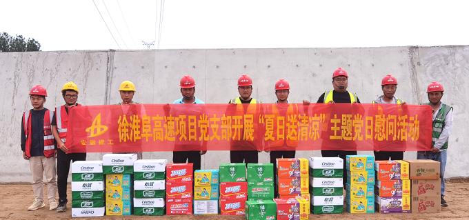 炎炎夏日送清涼,絲絲關(guān)懷沁心田。為傳遞建工交航黨委及工會(huì)對(duì)基層職工的關(guān)懷,致敬高溫下仍奮戰(zhàn)在高速項(xiàng)目一線的基層建設(shè)者。6月21日下午,在端午節(jié)來臨之際,徐淮阜高速項(xiàng)目黨支部開展“夏日送清涼”主題黨日慰問活動(dòng)。