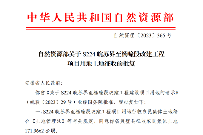 近日,在靈璧縣人民政府及各單位的共同努力下,建工交航靈璧S224皖蘇界至楊疃段改建工程項目用地土地征收成功取得自然資源部批復(fù),為加快項目建設(shè)提供了用地保障。
