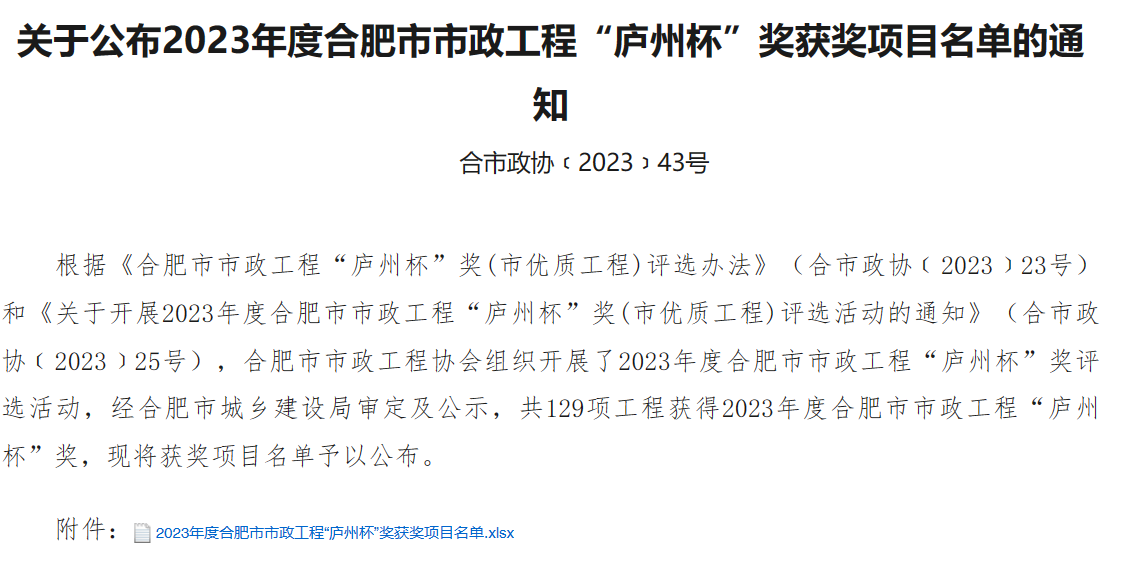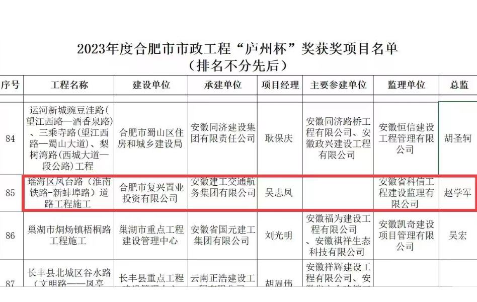 近日,2023年度合肥市市政工程“廬州杯”獎(jiǎng)已公示完畢,建工交航承建的瑤海區(qū)鳳臺(tái)路(淮南鐵路-新蚌埠路)道路工程市政項(xiàng)目順利通過評(píng)審,榮獲該獎(jiǎng)項(xiàng)。“廬州杯”獎(jiǎng)是由合肥市市政工程協(xié)會(huì)組織評(píng)審,經(jīng)合肥市城鄉(xiāng)建設(shè)局審定,是合肥市市政工程建設(shè)領(lǐng)域最高質(zhì)量獎(jiǎng)。