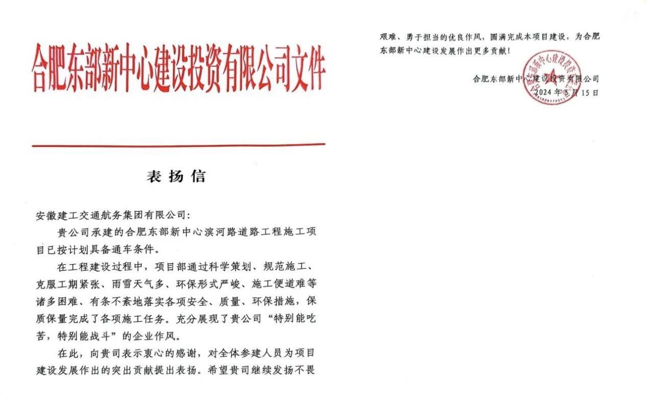 濱河路道路工程施工項(xiàng)目位于合肥市瑤海區(qū)東部新中心,2023年7月開工,項(xiàng)目建成后,將進(jìn)一步緩解城區(qū)交通壓力。5月15日,合肥市東部新中心建設(shè)投資有限公司向公司發(fā)來表?yè)P(yáng)信,對(duì)項(xiàng)目部攻克工期緊張、環(huán)保形勢(shì)嚴(yán)峻、施工便道不暢等諸多難題,保質(zhì)保量完成施工任務(wù)提出表?yè)P(yáng)。