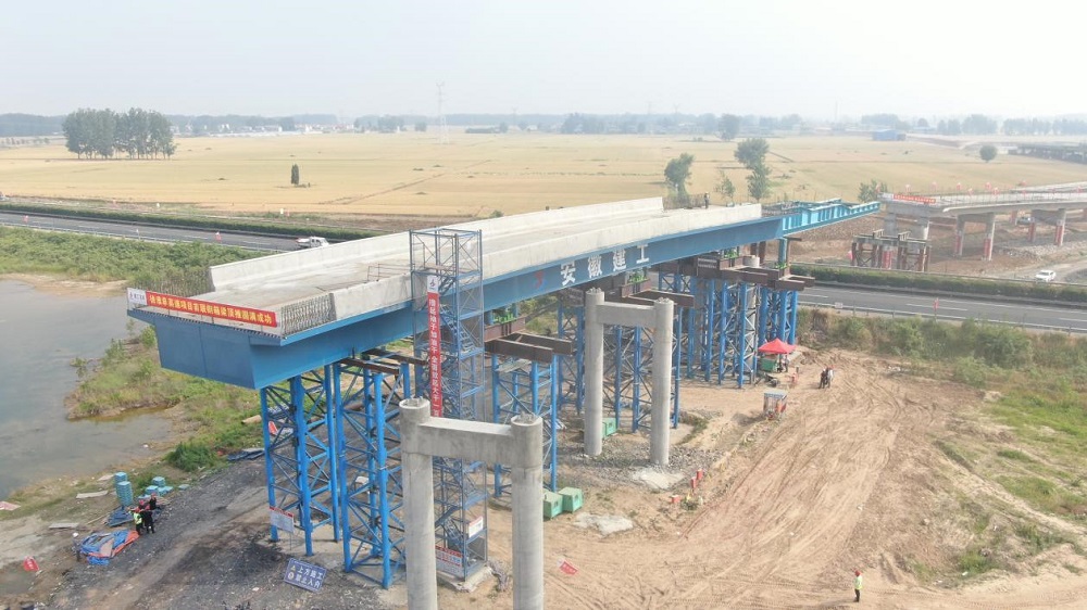 5月22日,隨著步履式頂推設(shè)備的平穩(wěn)運(yùn)行,徐淮阜高速宿州段路基工程02標(biāo)項(xiàng)目孫圩子互通上跨連霍高速G匝道鋼箱梁頂推施工順利拉開(kāi)了序幕,長(zhǎng)60米,寬10.5米,重達(dá)近400噸的曲線鋼箱梁在三維液壓千斤頂?shù)淖饔孟缕椒€(wěn)頂升、順利啟動(dòng),標(biāo)志著徐淮阜高速與既有線連霍高速的交通轉(zhuǎn)換銜接施工正式開(kāi)始,徐淮阜高速宿州段項(xiàng)目建設(shè)全面進(jìn)入沖刺階段。