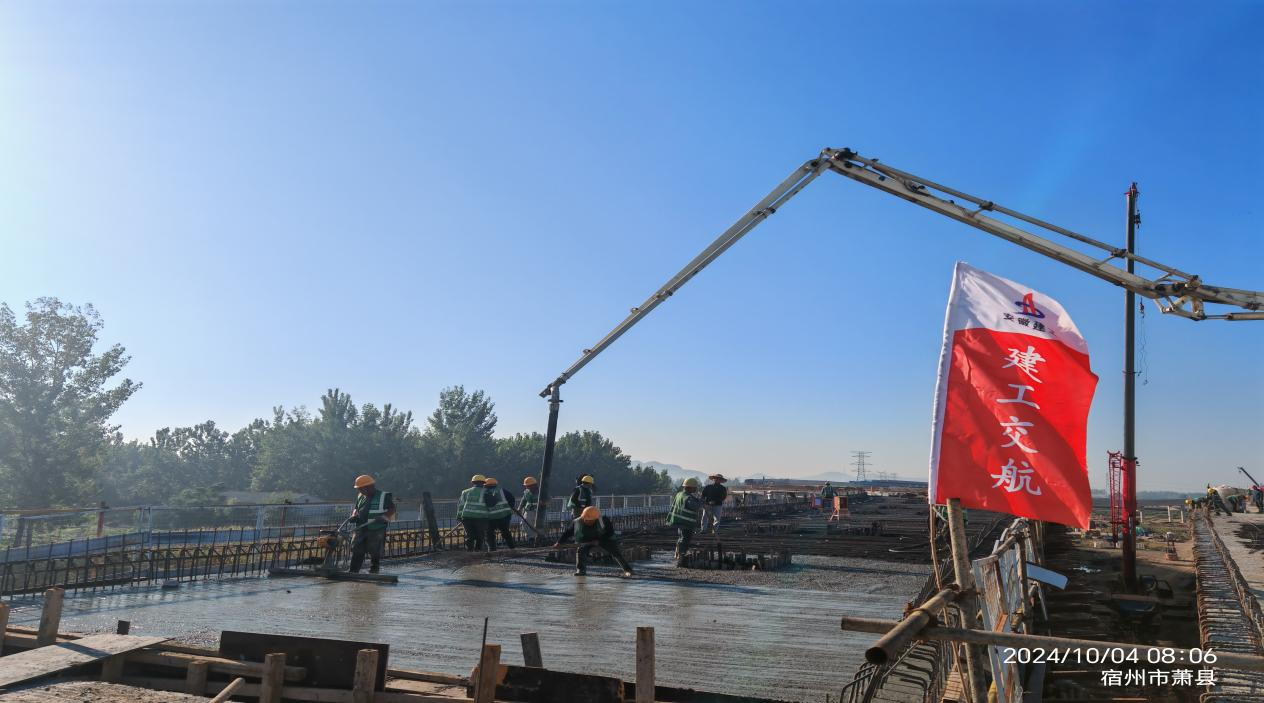 10月4日,經(jīng)過(guò) 10小時(shí)的連續(xù)奮戰(zhàn),徐淮阜高速宿州段路基02標(biāo)項(xiàng)目孫圩子互通C匝道橋最后一聯(lián)現(xiàn)澆頂板澆筑完成。這標(biāo)志著孫圩子互通區(qū)所有現(xiàn)澆梁全部圓滿澆筑完成,項(xiàng)目全面進(jìn)入快速收尾階段,為實(shí)現(xiàn)早日通車(chē)目標(biāo)打下了堅(jiān)實(shí)基礎(chǔ)。