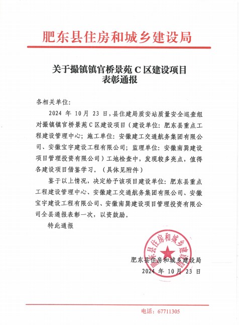 近日,公司在建撮鎮(zhèn)鎮(zhèn)官橋景苑拆遷恢復樓C區(qū)建設項目喜獲肥東縣住房和城鄉(xiāng)建設局全縣通報表彰。